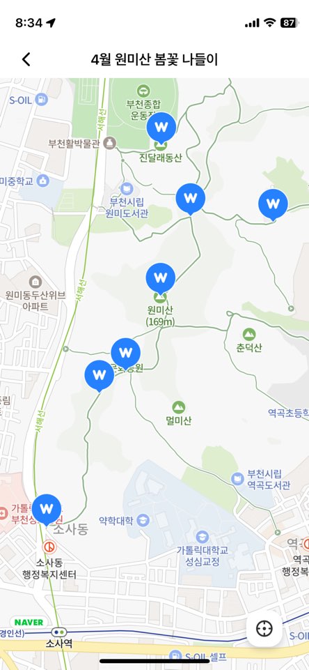 워크온 챌린지 지도_스탬프를 지나가면 회색에서 파랗게 표시된다.