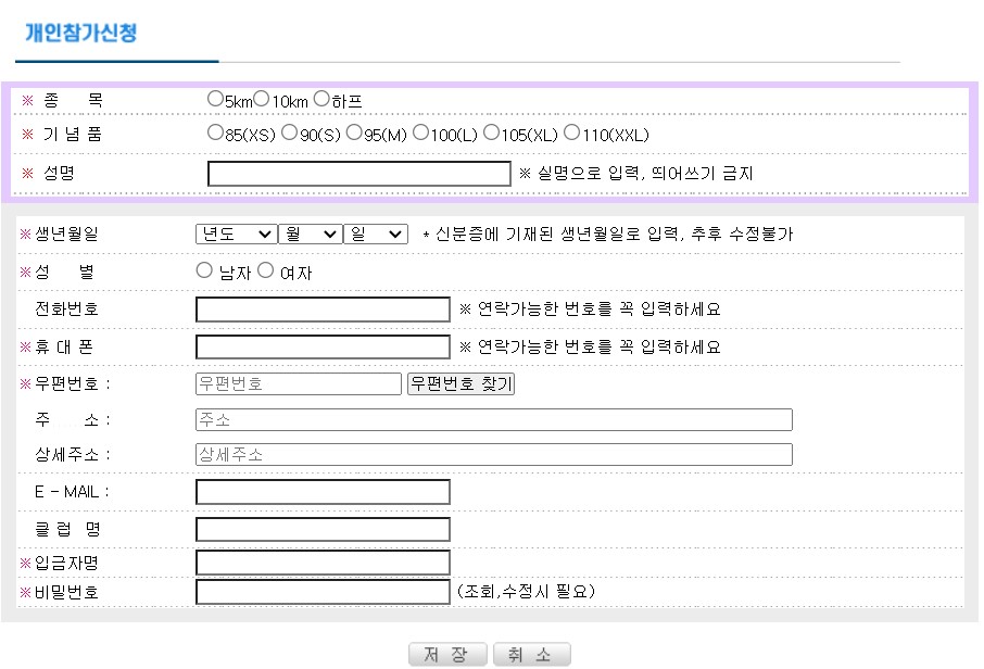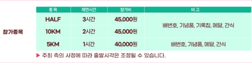 참가비 : 하프코스(21km)와 10km코스는 45,000원, 5km코스는 40,000원